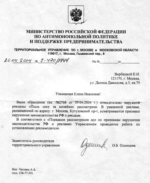 В ответ на коллективное протест жителей района "Дорогомилово" г. Москвы против рекламы пылесоса "LG", размещенной торговой сетью "Эльдорадо", территориальное управление МАП сообщило, что данная реклама действительно нарушает российское законодательство. В письме говорится, что в настоящее время "проводится работа по установлению рекламодателя". Мы надеемся, что рекламодатель будет найден и наказан.