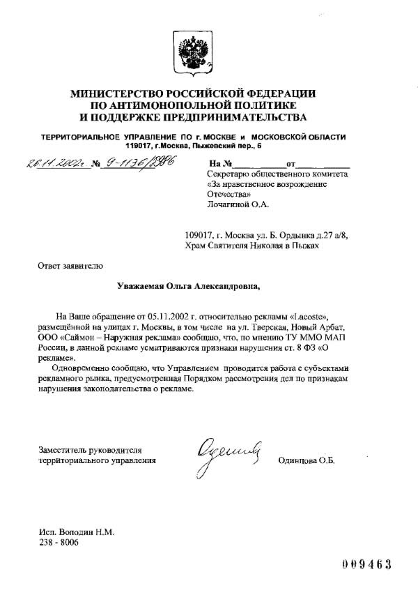 На днях Московское отделение Антимонопольного министерства (ТУ ММО МАП РФ) сообщил, что в рекламе фирмы "Саймон" усматриваются признаки нарушения 8-ой статьи Закона о рекламе. Эта статья запрещает неэтичную рекламу. Это письмо получено в ответ на протест Общественного Комитета "За нравственное возрождение Отечества".