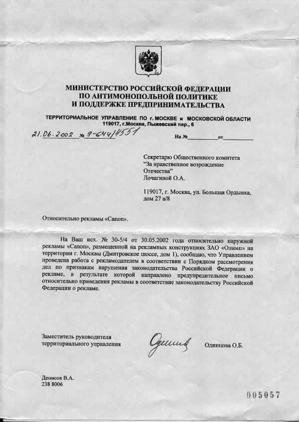 Со щитов рекламной фирмы "Олимп" сняты плакаты фирмы Canon. Это произошло после протеста Общественного Комитета "За нравственное возрождение Отечества". 30 мая Комитет обратился столичное управление Министерства по антимонопольной политике (ТУ ММО МАП) с призывом снять непристойную рекламу фотоаппаратов фирмы Canon.